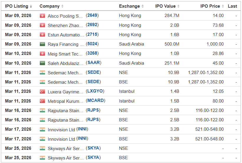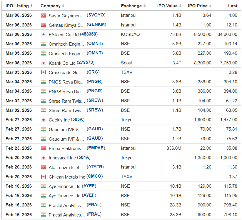 Frontier and emerging market highlights from IPOScoop.com and Investing.com (NOTE: For the latter, you need to go to Filter and “Select All” countries to see IPOs on non-USA exchanges):