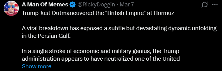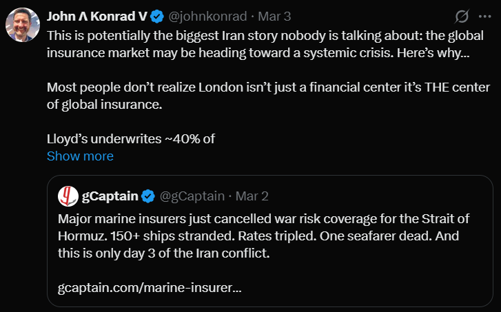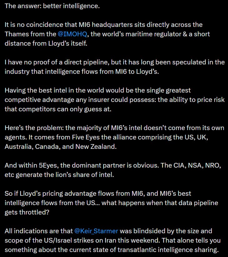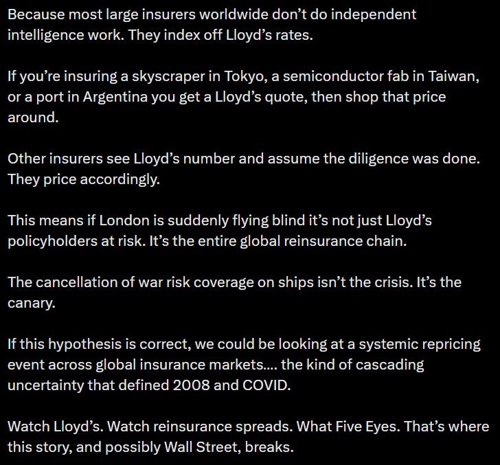 With war raging in the Middle East, this is one thing that seems to be flying under the radar (including of even many non alt-media commentators): Trump/USA appear to be making moves to grab the Lloyd’s of London etc. controlled maritime insurance business.
