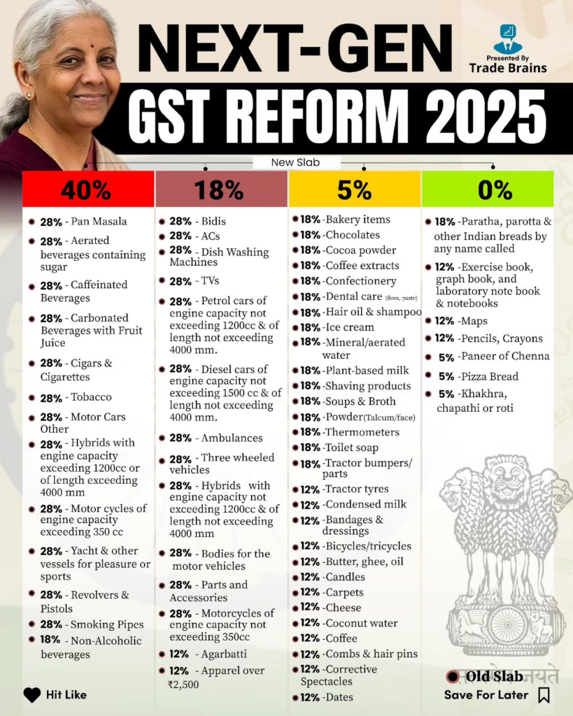 At the same time, items such as paratha, exercise and laboratory notebooks, maps, pencils, crayons, paneer, chenna, pizza bread and chapathi or roti, which were earlier taxed at 18 percent, 12 percent or 5 percent, were placed in the 0 percent slab, while a separate set of goods was aligned to the 18 percent slab. The most notable change came at the top end, where goods previously taxed at 28 percent, including pan masala, aerated beverages containing sugar, tobacco products, motor vehicles, high-capacity motorcycles and yachts, were moved to the 40 percent slab, replacing the earlier 28 percent plus cess structure.